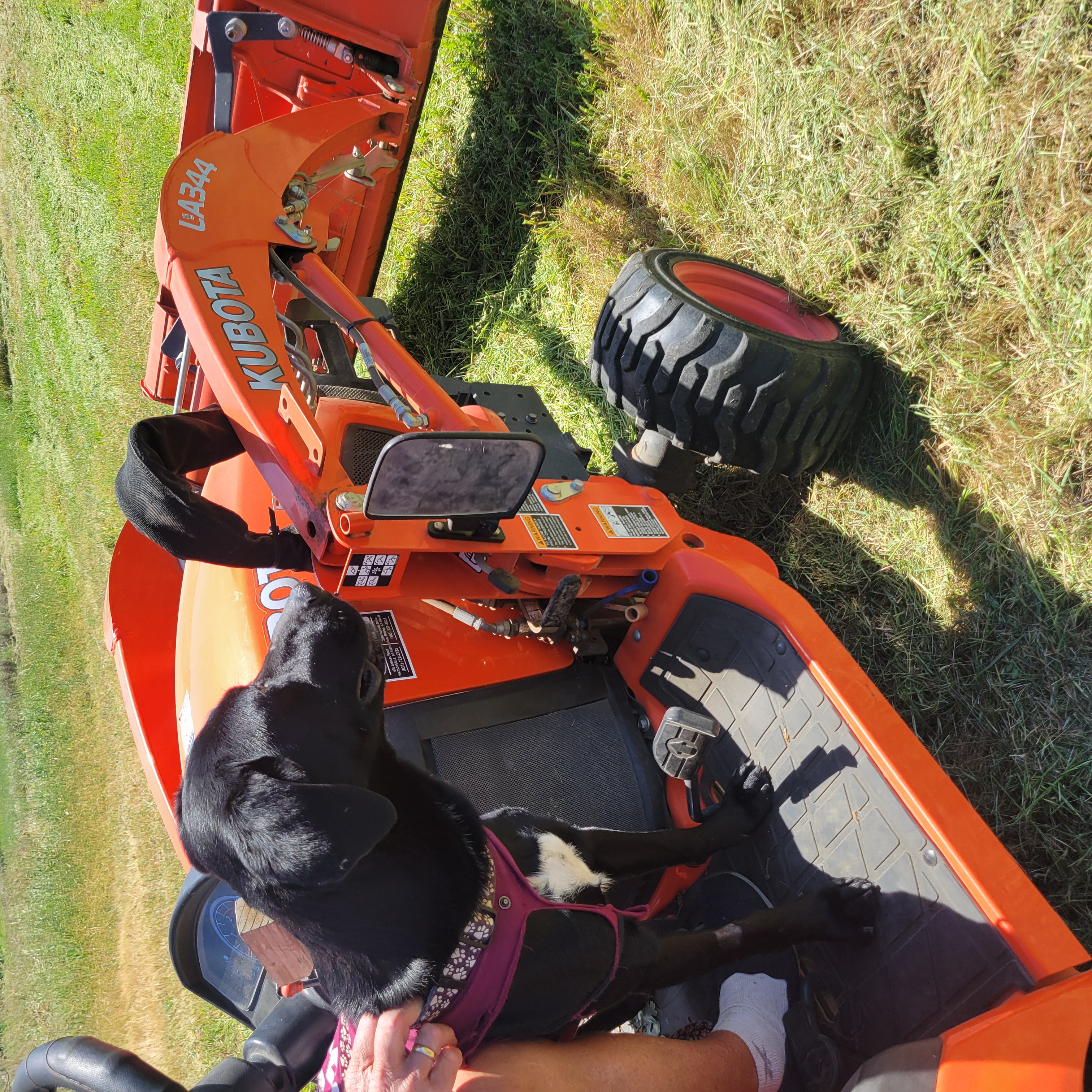 What Emmeline's Temp Foster Says: She spends her day mostly resting or circling. It is a lot of work for her to get to the water bowl but she figures it out. I have a large water bucket to make it easier for her. She was unable to drink out of a regular dog water bowl. I have not seen her play with any toys. She does well on walks if it is a route she is familiar with, walking mostly in a straight line, but on new routes she circles a lot. She has not barked once, but does whine at dogs and cats and in her crate. She does not like the crate but puts up with it. She needs one big enough for her to circle in. She seems house trained but I am taking her out often. She does try to chase cats, and she loves my dogs and they like her outside, but her circling makes them uncomfortable in the house so I have them separated. She will try to get on furniture and is a true Lab and will do whatever she can to get food. She had no problem jumping right onto our tractor when we walked by it (she was only on it when it was stationary but I included the picture because she looked so cute). She sits for her dinner. I think she had training at some point but won't sit on command. She is a sweetheart, has shown no aggression, and is super cute. She loves people and other dogs.