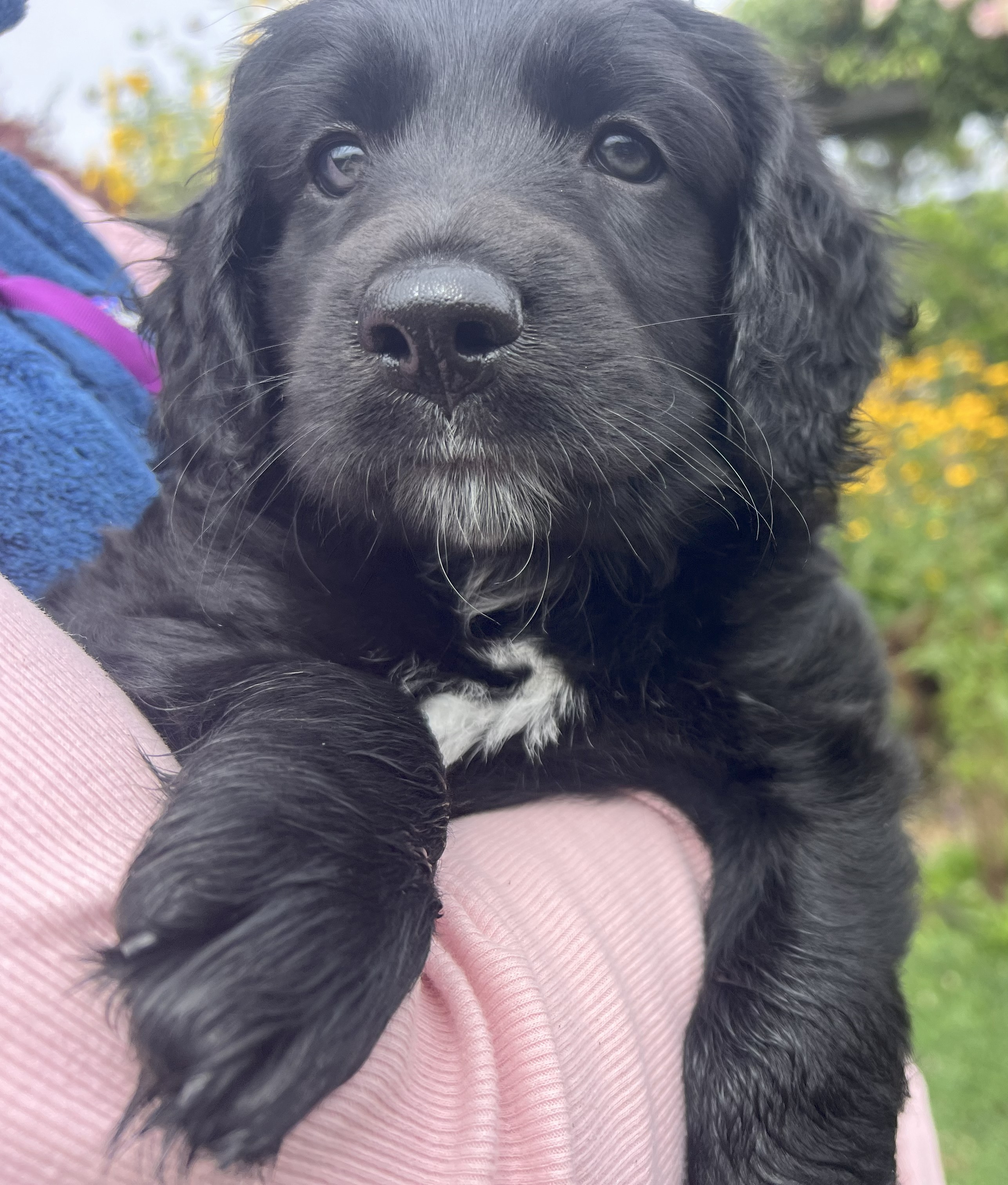 What Current Foster Says: What a delightful puppy. Plays hard and sleeps great. Finn has longer black fur, super soft, big ears. Mostly mellow, but spurts of energy. Observant and a bit wary of new things. Watches his sibs before jumping in. Doing pretty well at housetraining. Enjoys being handled, snuggled, carried, etc., but only when he's up for it. Wriggles and thrashes if he wants down. Not super food driven. Not a barker.