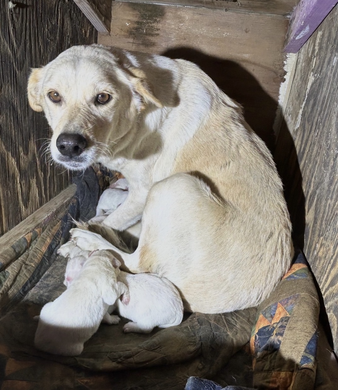 Background: In coordination with Labrador Retriever Rescue of Fresno, https://labrescuefresno.org/, in mid-December we received Gracie (we named her that) and her seven puppies from their central valley owner who was unable to properly care for them. The pups were born on December 5th and had been living in a wooden box in the backyard... as they were being nursed by Gracie. The puppies were weaned a week ago and we shifted Gracie to a foster to start the next chapter in her life