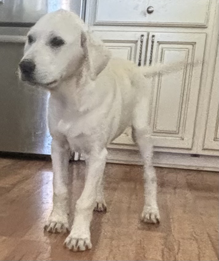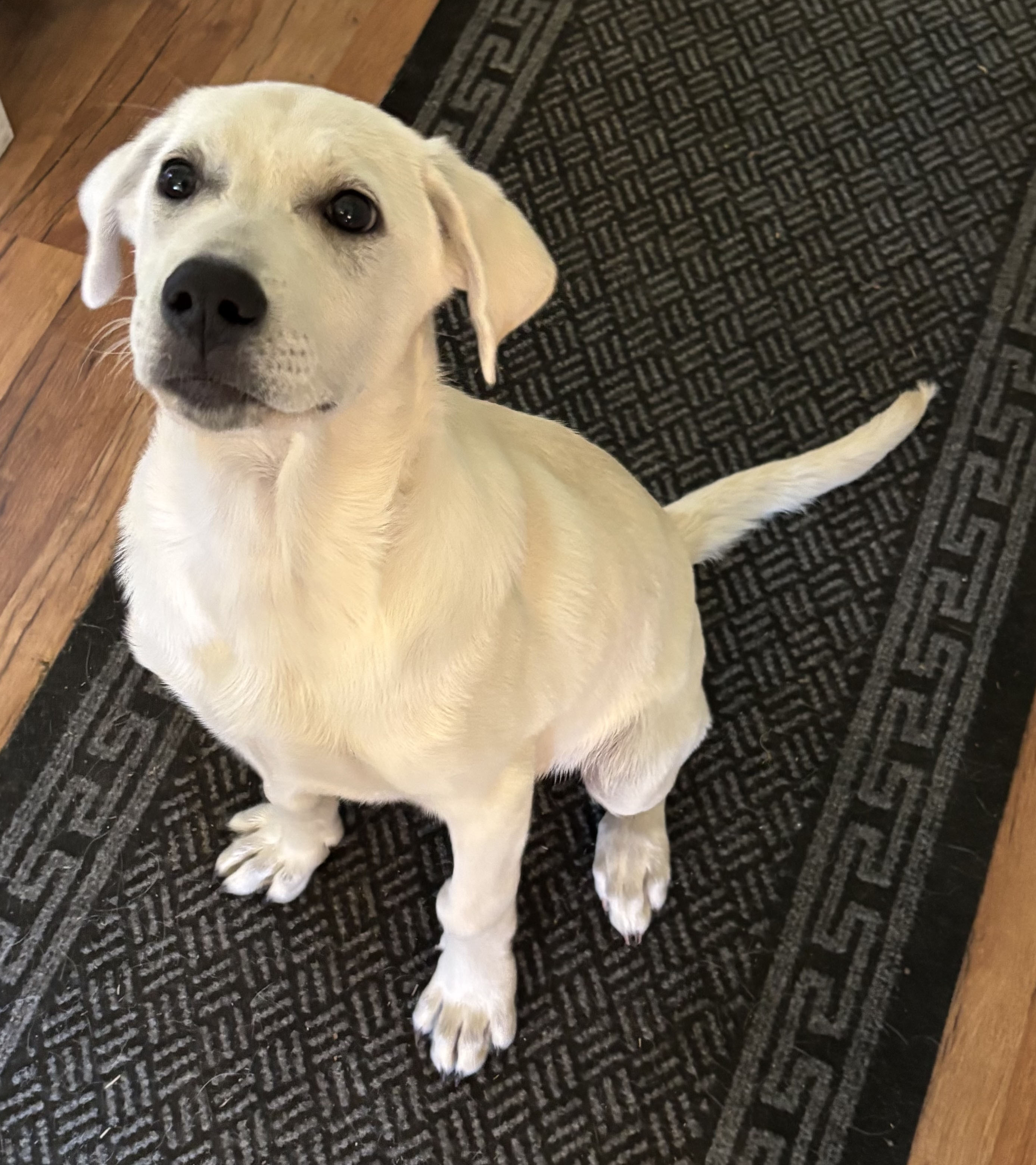 Background: Mama and her seven puppies (six boys and one girl) were surrendered to us from their central valley owner. The pups were born on December 5th and had been living in a wooden box in the backyard. We believe the puppies' dad is a mix (see his photo) --we thought, at first, he might be a Great Pyrenees mix, but a local Great Pyrenees rescue saw his photos and video and said "That ain't no Great Pyrenees." Mama is a mix too. So these puppies are "supermutts" -- blends of many breeds -- perhaps with very little Lab in them. Six of the puppies have been adopted. Red is the last one up for adoption.
