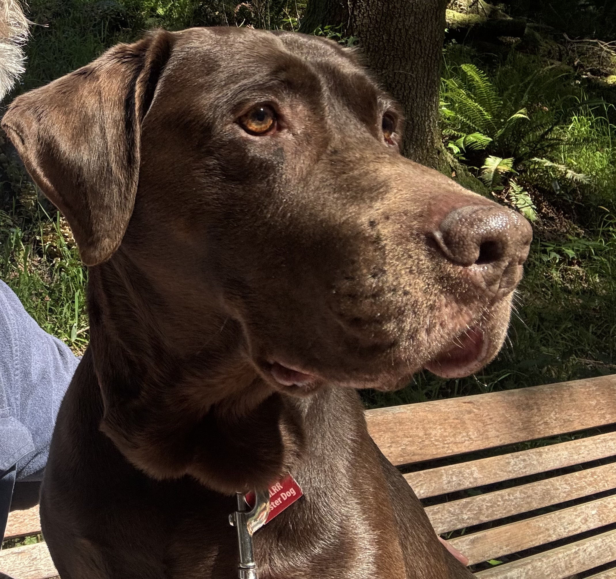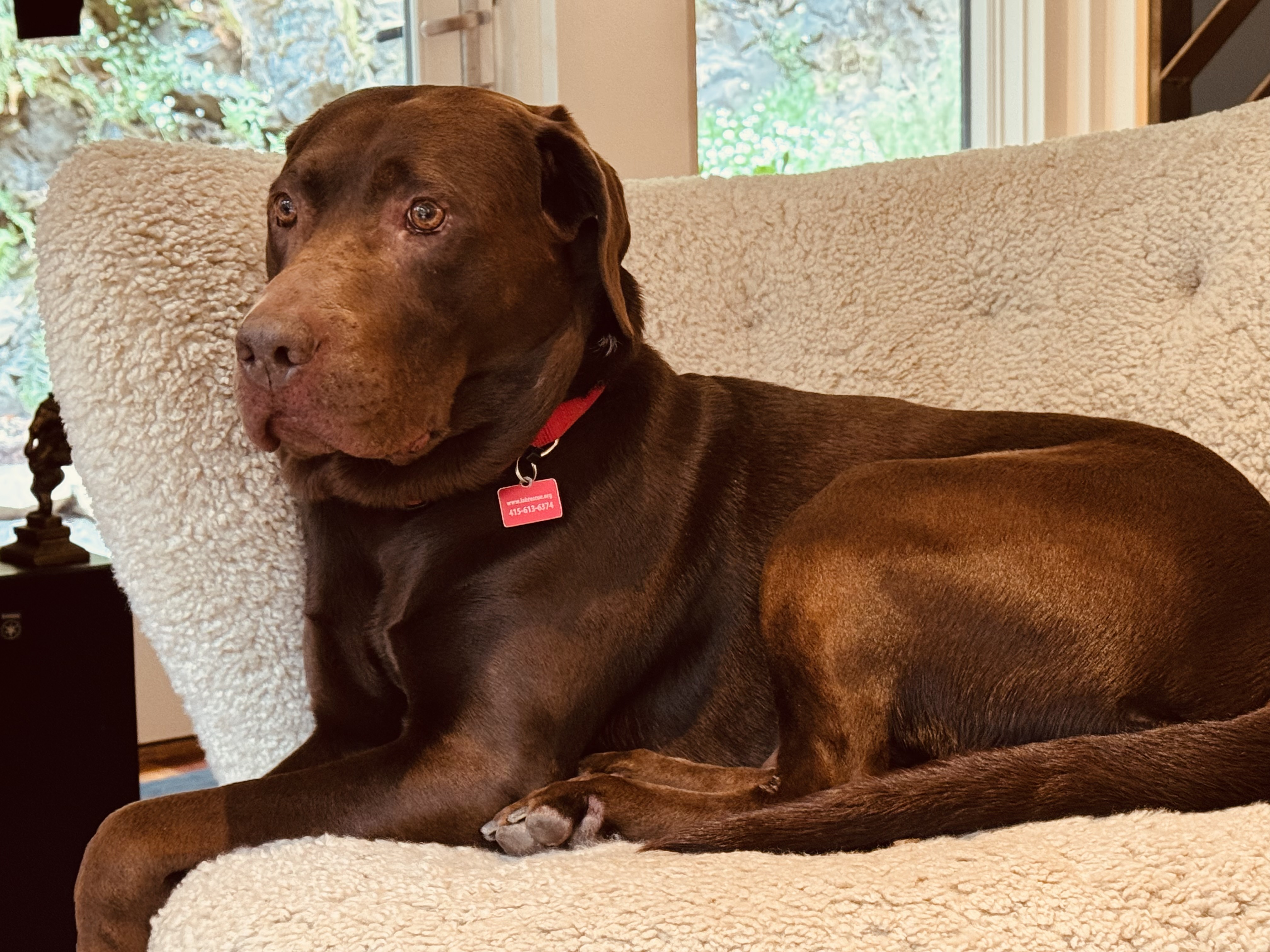 What Monza's foster Says: Monza is a healthy chocolate lab, who is reported to be close to 8 years old, but seems much younger. He has lots of energy, a gentle mouth, and is very food motivated. He is very attentive and affectionate, eager to play, and eager to please. Monza is obviously quite intelligent and knows several basic commands (sit, stay, shake, lay down). His recall is inconsistent at this point, and he does not appear to have much leash training. But he is eager to learn. We have let him off leash outside our home, and he loves to explore but stays close and does not show any temptation to run off. As he is an intact male, we have been careful to avoid public dog parks; the limited interactions he has had with a few other dogs thus far are positive. In his new home, he will need plenty of exercise, a backyard in which he can run, and a couch to snuggle up with his family.