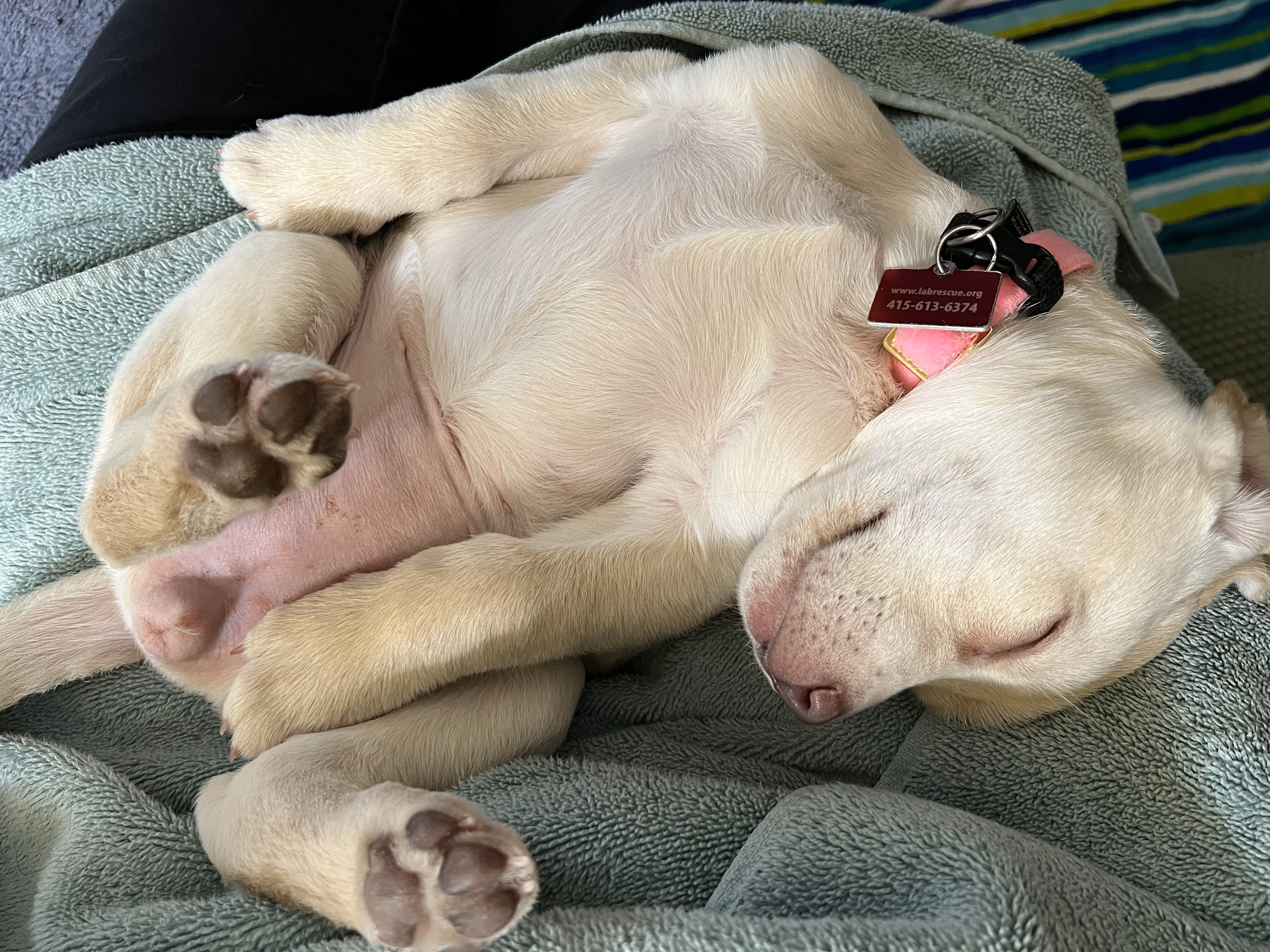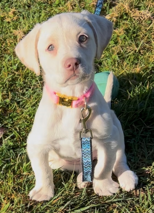 What Pink's Foster Says: Pink is an active, smart puppy that loves to play and snuggle. A very social puppy, she also is happy to entertain herself with toys either under supervision in the backyard or in her xpen in the house. Pink is also happy to explore the backyard following around my 7-year-old dog, Missy. Missy has been correcting Pink when she gets too nippy with her. Pink is mostly responsive to those corrections, however if she is in super excited puppy mode, I will separate them. I always have puppy toys available to switch out with Pink if she is wanting to chew on people or other inappropriate items - she still has her sharp puppy teeth. Eat, play, sleep - perfect day for Pink. She sleeps in a crate/x-pen at night and we are working on potty training. Pink successfully navigates indoors and outside. Her vision limitations aren’t a deterrent for her - no bumping into things, no problem navigating the two steps from the house to the yard, finding the steps up to the deck, or exploring the backyard.