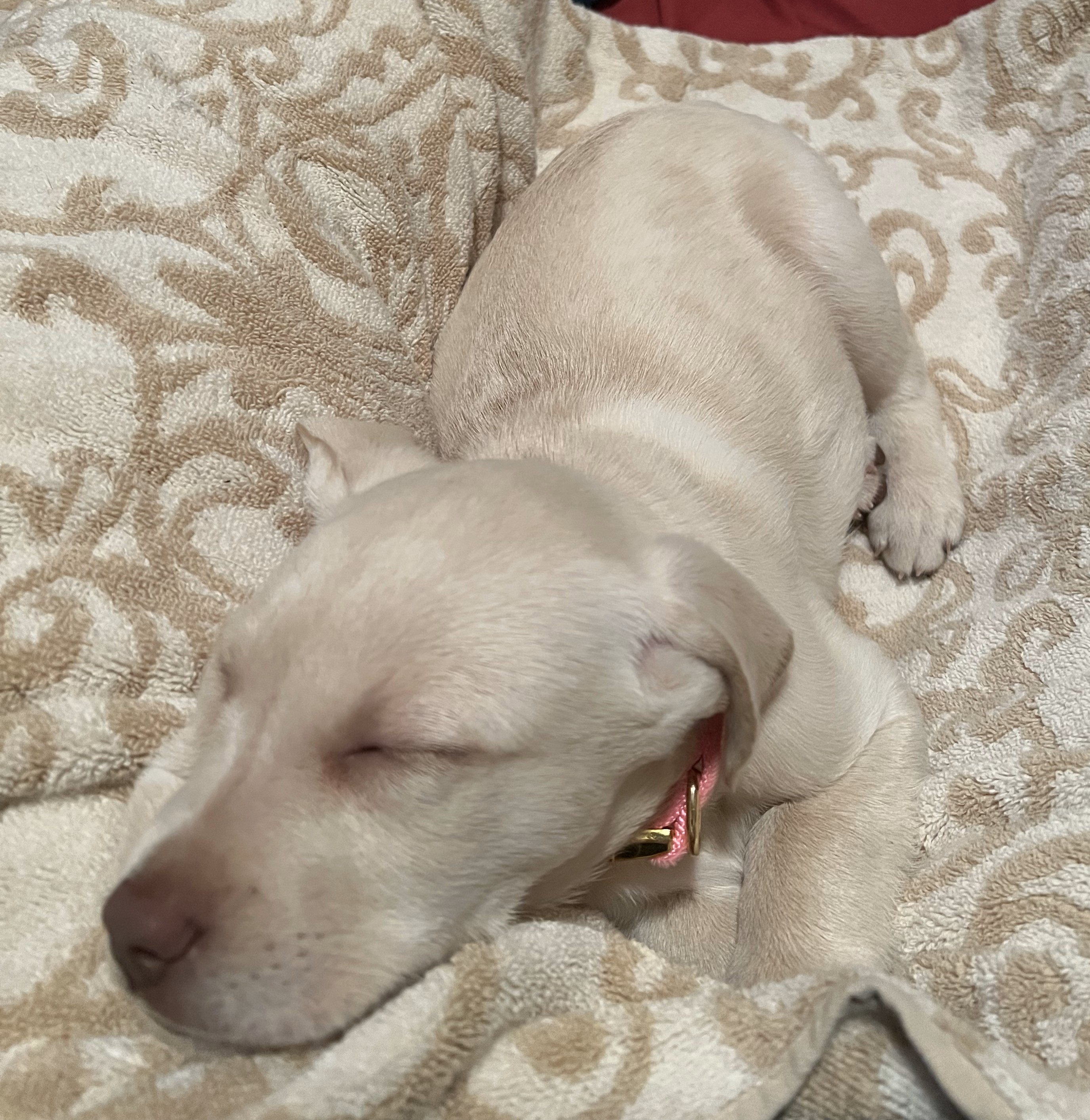 Medical: In good health. Has had one of three distemper vaccinations. One of our vets believes that Pink does exhibit the signs of dwarfism (chondrodysplasia). Her legs are shorter and her front paws are turned outwards (much like a basset hound). Our vets report that she might get arthritis in her joints earlier than expected. We took Pink to an eye doctor on 02 January. That vet determine that Pink's right eye has a detached retina resulting in likely no or very limited vision in her right eye. She has some very small cataracts in her left eye but they are not large enough to impact her vision at their current size. We are quite impressed with Pink's ability to get around and navigate things in her world despite these eye issues. Despite dwarfism, Pink is taking the new world by storm. Gonna be hard to hold this girl back. Pink is not fully vaccinated yet, so she will be confined to the adopter's home and backyard until mid-February, when she gets that third distemper vaccination, to ensure he does not contact parvo or some other disease that is harmful to puppies. Lab Rescue will work with the adopter to spay Pink down the road.