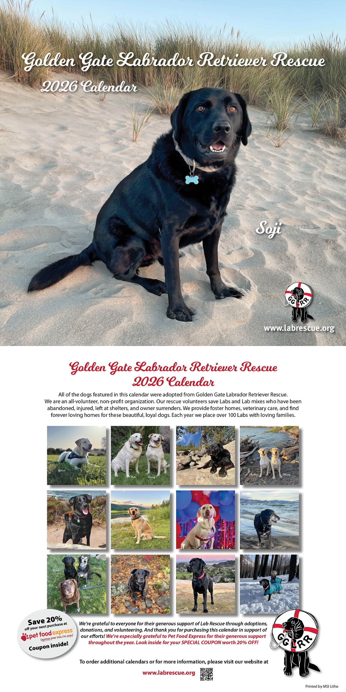 The 11" x 11" calendar is full-color and top-quality. Professional design and printing services were donated, so all proceeds from the calendar go to helping more homeless Labs.