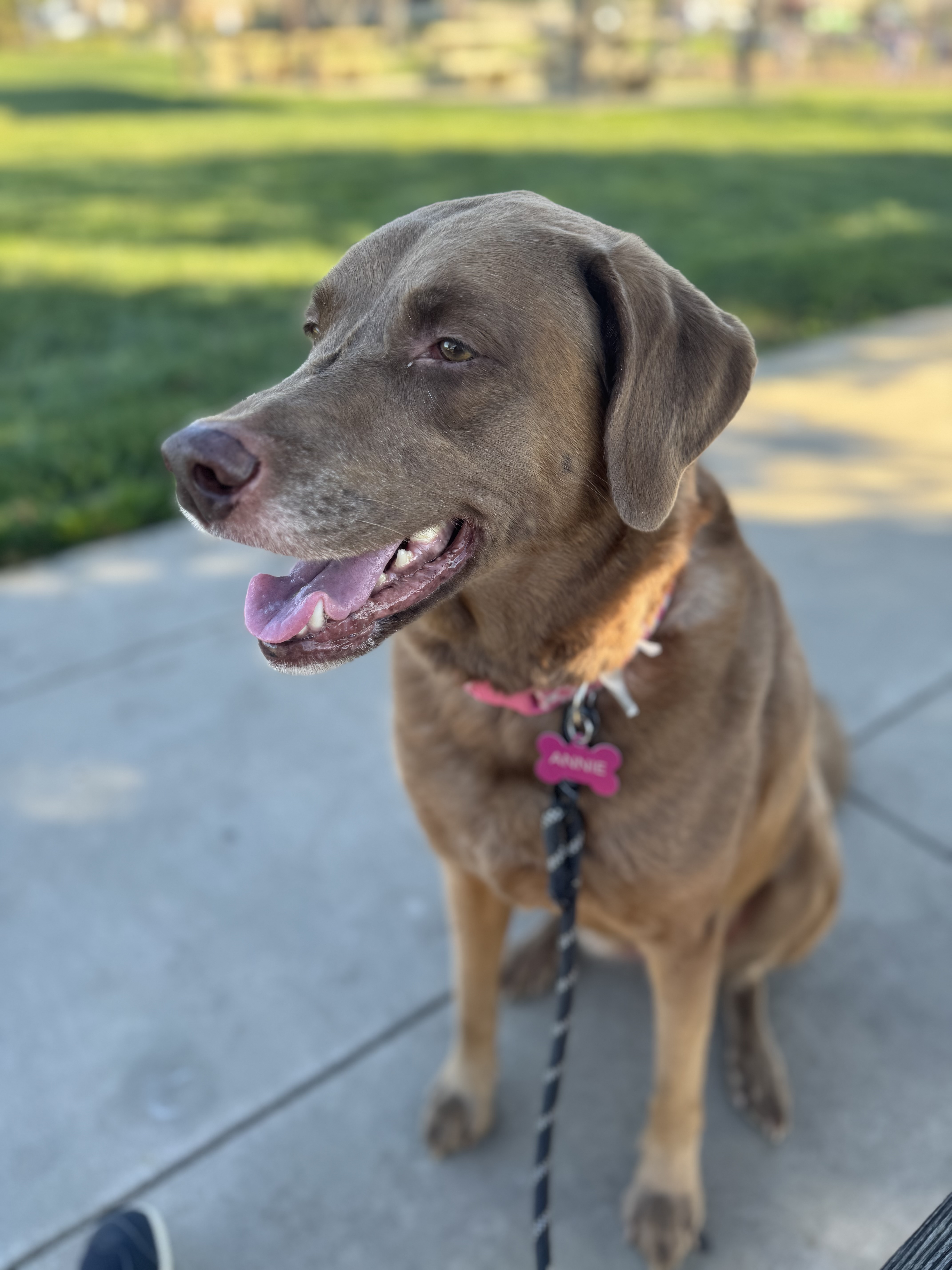 What Annie's Owners Say: It’s with a heavy heart that we’re looking for a new home for our beloved chocolate Lab, Annie. Annie is a 90-pound sweetheart with a big heart and an even bigger love for the simple things in life—carrots, cozy naps, and being close to her people.