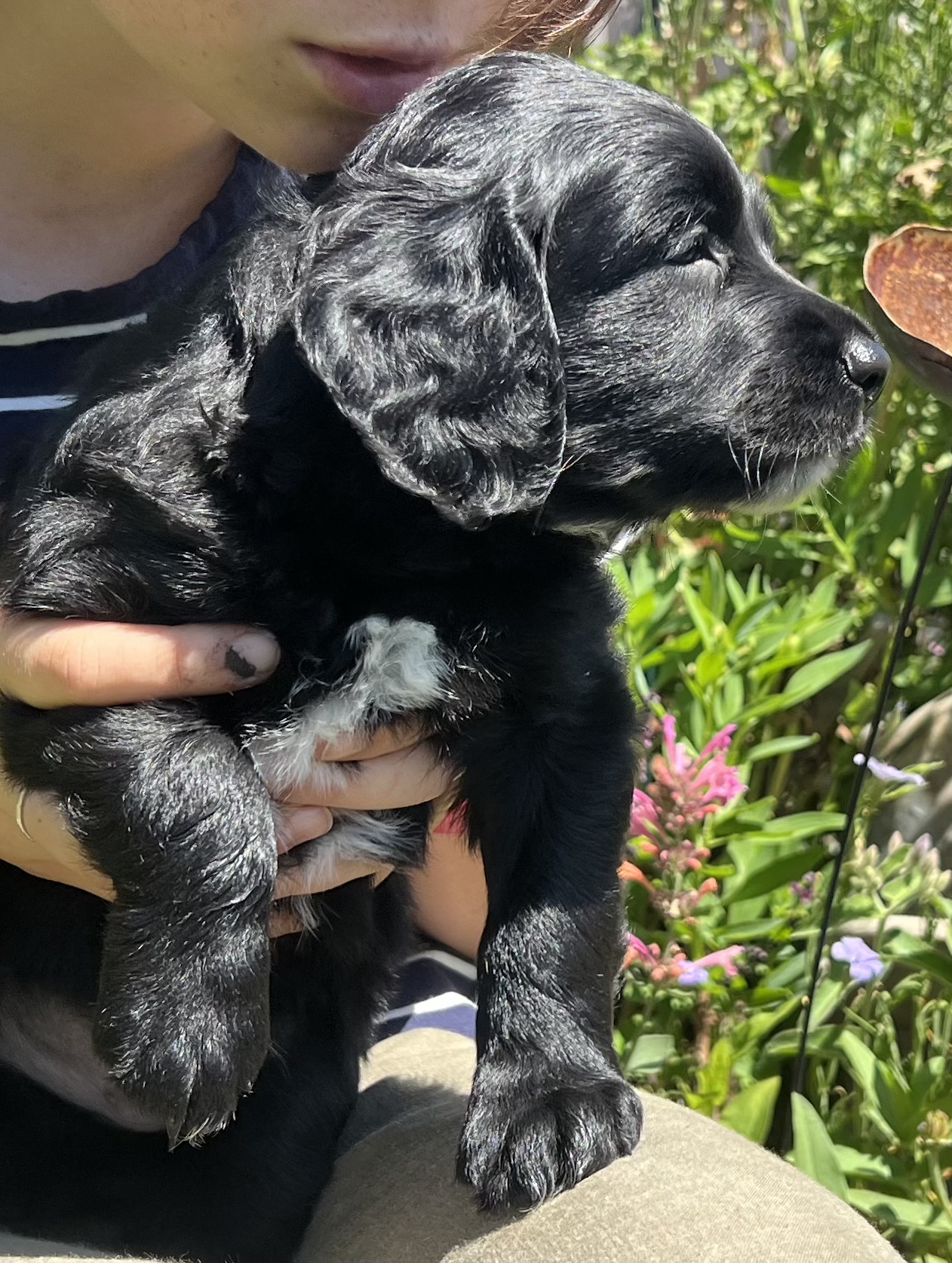 What Current Foster Says: What a delightful puppy. Plays hard and sleeps great. Finn has longer black fur, super soft, big ears. Mostly mellow, but spurts of energy. Observant and a bit wary of new things. Watches his sibs before jumping in. Doing pretty well at housetraining. Enjoys being handled, snuggled, carried, etc., but only when he's up for it. Wriggles and thrashes if he wants down. Not super food driven. Not a barker.