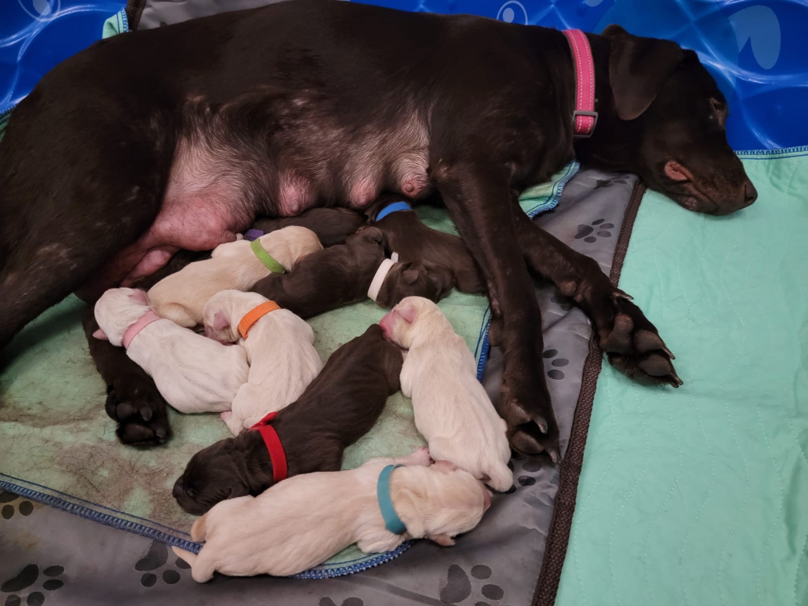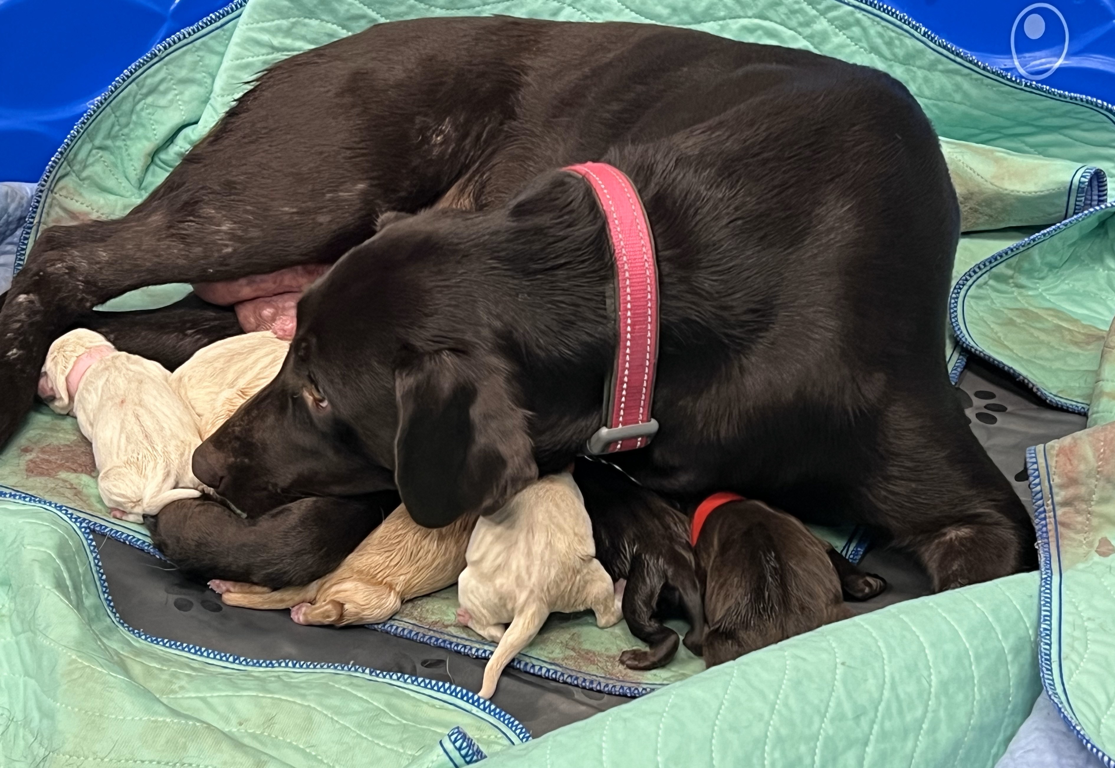 Background: Chocolate young female Lab "Molly" gave birth to nine healthy puppies on Halloween. Not tricks here. A total treat! We think dad was a chocolate Lab too. Molly is currently focused on nursing her squeaky pups. We have six male puppies (3 chocolate, 3 yellow) and three female puppies (1 chocolate, 2 yellow).