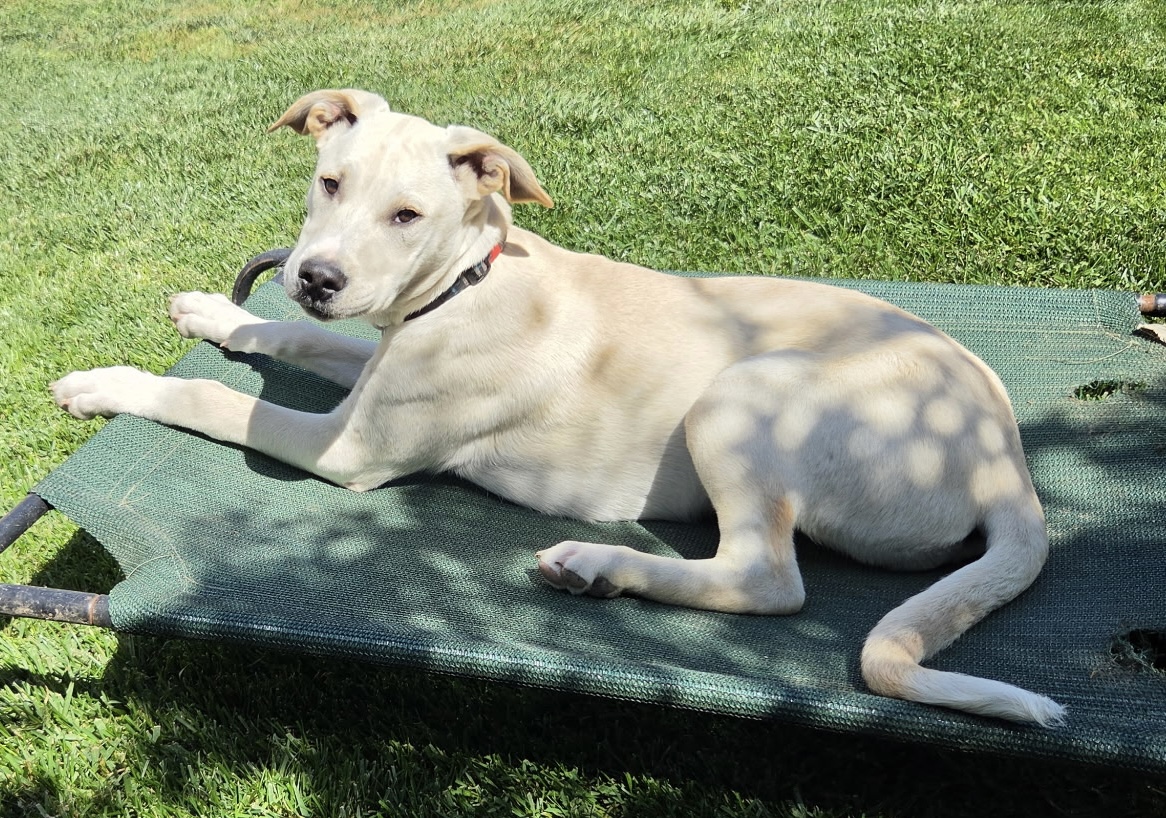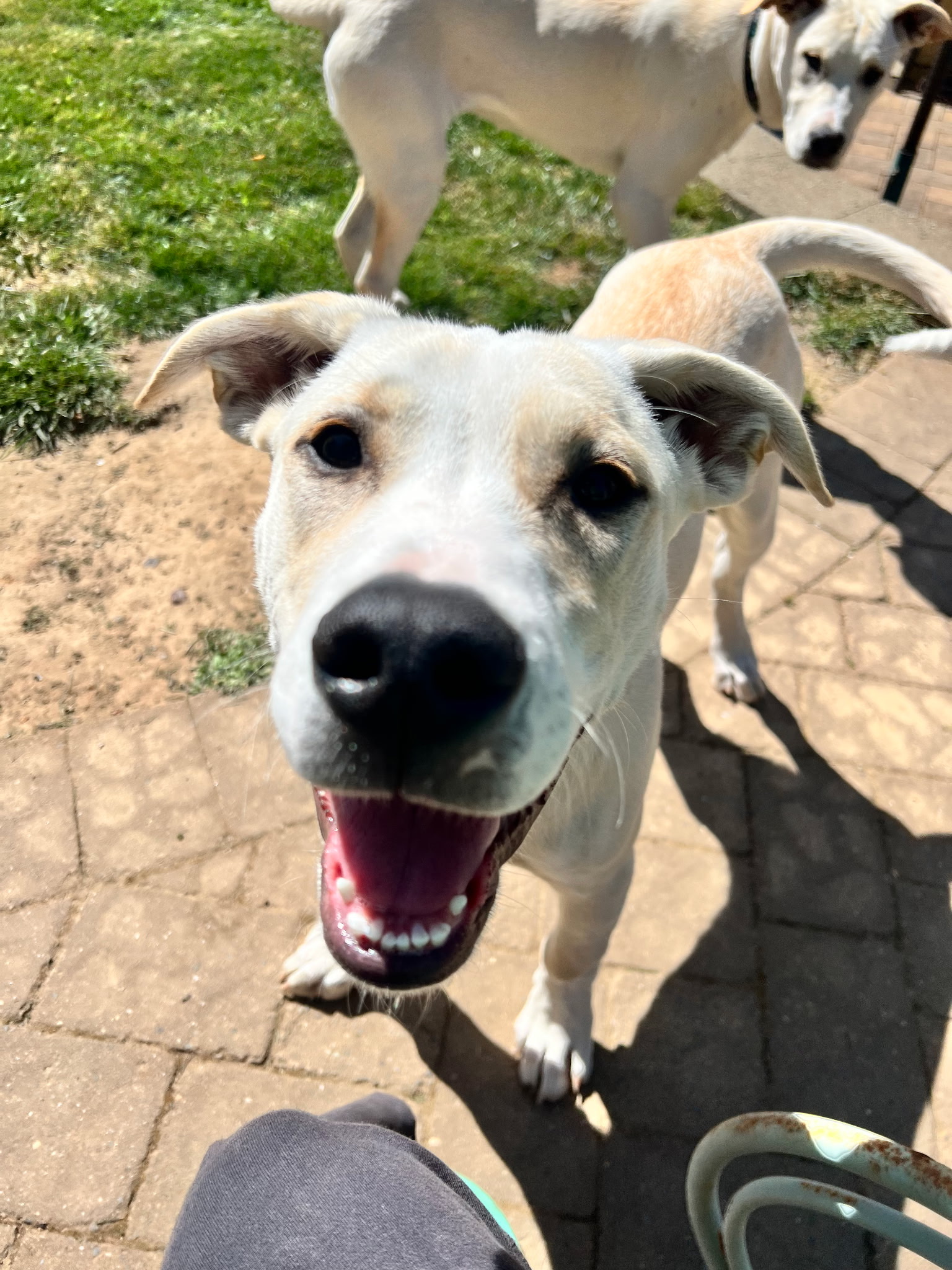 What Sadie's Current Foster Says: She is one of the sweetest girls ever. Couldn’t find a better puppy to love and be loved. The minute she came into our house, she just wanted to give kisses and be with us. She does very well with our 2 Labs. With our 6-year-old Lab she is respectful and kisses his face. He was the one to welcome her and Rosie and show them the ropes at his house. Our 1-year-old Lab has been rough and tumble with both Sadie and Rosia and they take it in stride. We have play off-and-on all day, but mid-day is definitely rest time. Sadie sleeps great, almost completely through the night. Sometimes we get up at 5:30 AM and go take care of business and then go back to bed. Often she just sleeps on the dog bed next to my bed when I’m not ready to start the day yet. Unlike most puppies I’ve had or fostered, she settles right back down and let me sleep. She is close to being potty trained - may have an accident when she is nervous. Sadie is learning commands and will sit for food and treats. We are working on recall and since we are usually at home, it hasn’t been much of a challenge as they know I often have treats or they are following the other dogs. Sadie and Rosie love carrots and frozen mango as well as the traditional dog treats. They are both crate trained and also get along with our cats who have trained them to not get too close. We have had kids (about 10 years old) around and they absolutely loved them. Sadie and Rosie like playing tug of war & chase with each other and enjoy being outside sunbathing as well as with us wherever we are. Whoever gets Sadie is going to be incredibly lucky to get such a sweet and loving companion. Sadie is not as hard charging as Rosie, but doesn’t shy away from play. She just gets away from it when she wants a break; and then she heads back in when she is ready. She is more exploratory and found a place to get out of our yard, which none of the other puppies here ever have. However, she came right back when I called her and we have since fixed the issue.